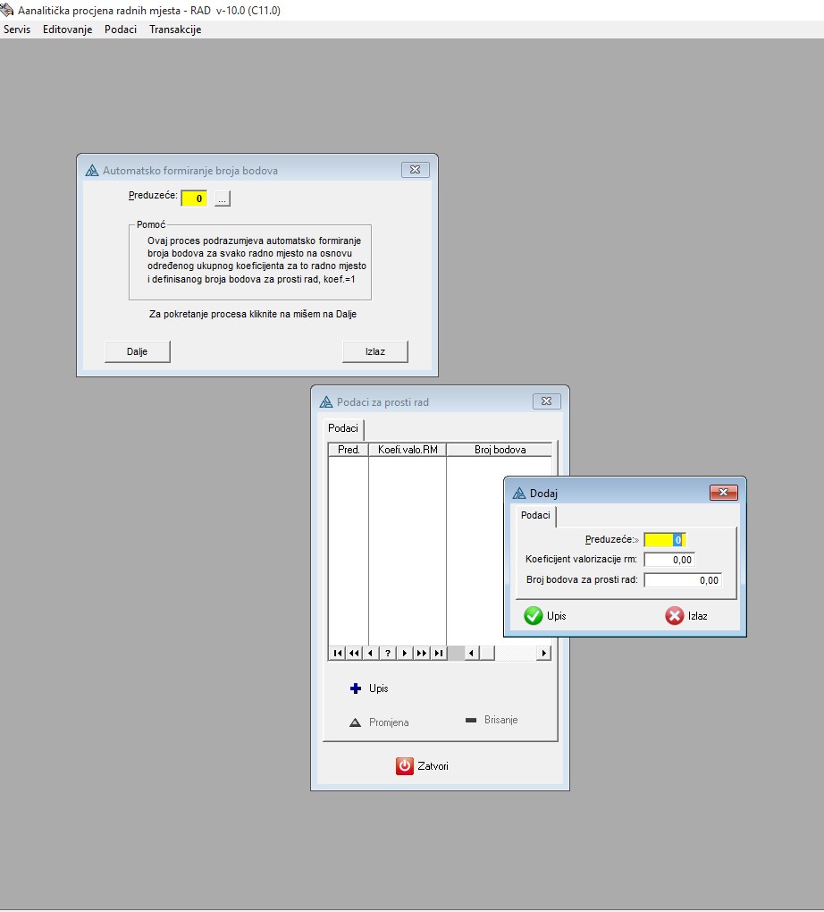 Rad analiticka procjena radnih mjesta. Na osnovu definicije cijene prostog rada u bodovima i određivanja koefijecinta za konkretno radno mjesto, generisaće se broj bodova za svako radno mjesto.